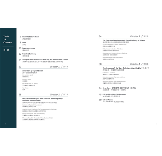 第四章〈永恆之美〉是一篇針對汝窯的細緻研究,探討其藝術性與市場意義。最後ANF藝術金融年報以〈神性的注視〉封面故事作為2018年報內容的最終章。