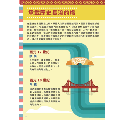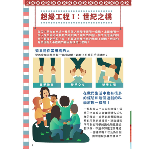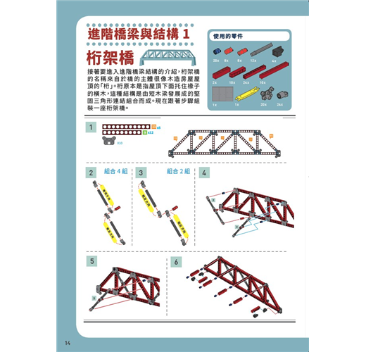 .64頁學習手冊,包含認識橋梁的歷史演進與工程知識,多樣化積木實驗課,由淺至深、逐一解決問題。從實際應用與回饋機制中,重新學習知識,並且找出自己的興趣。