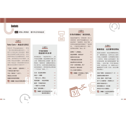藉著說故事的方式,將拖延症的行為模式、危害,再到拖延產生的深層原因、解決策略,淺顯易懂的帶讀者循序漸進解開關於拖延的謎團、培養自我檢視的能力,戰勝拖延。