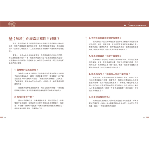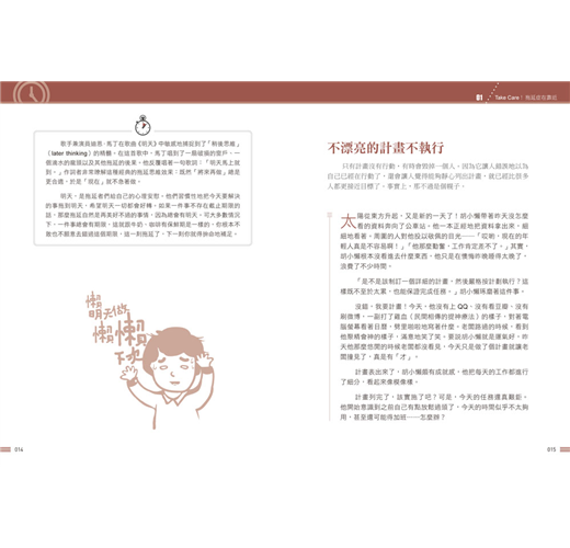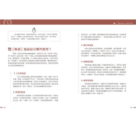 「這本書寫得很好,拖延表現在生活中的點點滴滴,尤其是一些小事情上,總是被忽略,變成習慣,然後變得理所應然、越拖越嚴重。即將走出社會,希望自己能夠克服!」