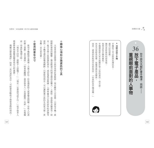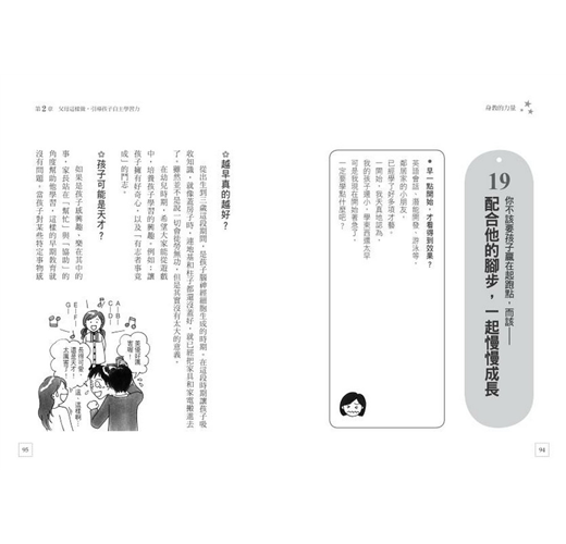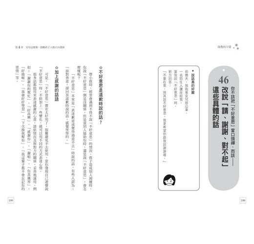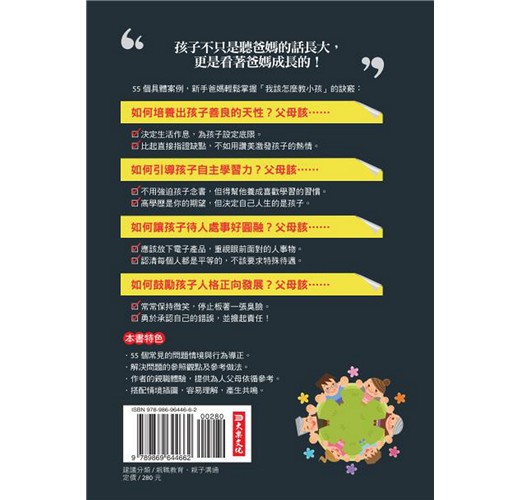 最後,為了讓新手爸媽輕鬆掌握「該怎麼教小孩」的訣竅,本書提供55個具體案例,介紹什麼行為該做、什麼行為不能做,以及如何改變自己的觀點與做法,能兼顧爸媽的立場與孩子的感受。