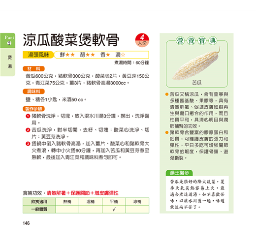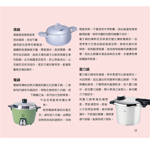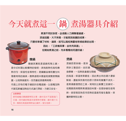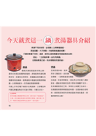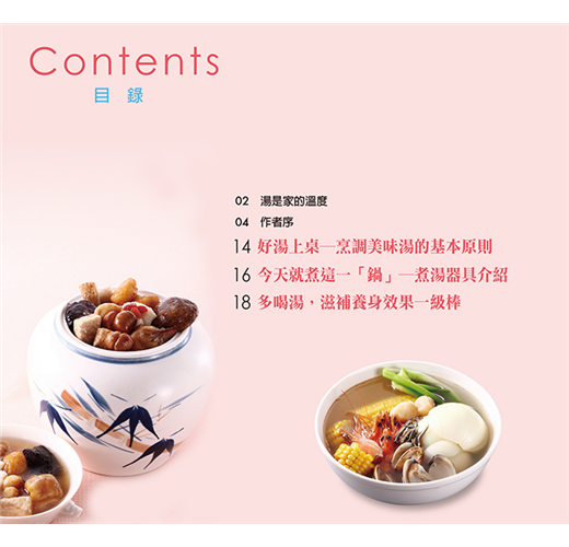 ◆介紹煮湯的技巧訣竅:內容有可口家常湯、小火煲好湯、自己做羹湯、養生滋補湯等單元,介紹各種不同的煮湯技巧與美味訣竅。