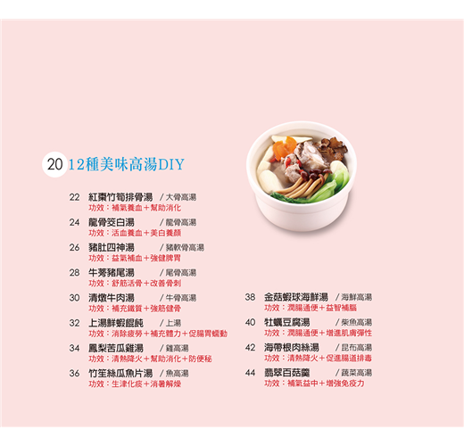 ◆條列喝湯的保健功效:每道湯品皆條列主要食材保健功效,快速增進喝湯養生的自我保健知識,方便又實用。