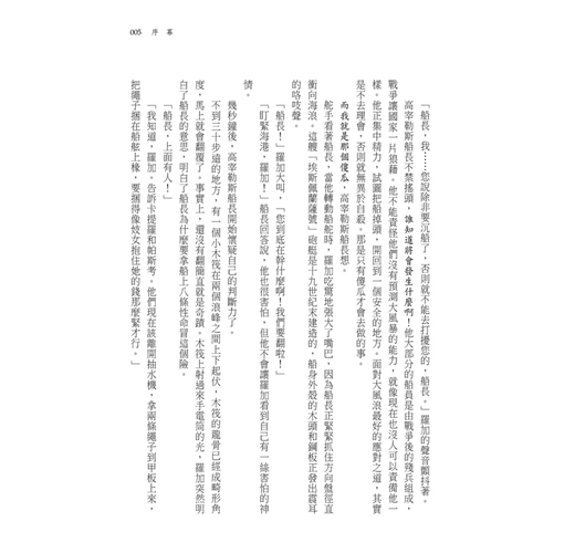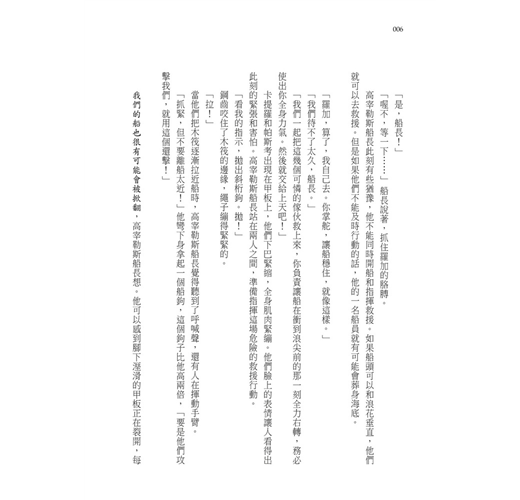 「兩個星期後你和你的媽媽搬來和我們一起住。你當時還是個小男孩,我很高興,因為這樣我就可以和你一起玩了。我甚至根本就沒想我父母告訴我的話,那其實是很明顯的謊話:他們說姨丈的護衛艦沉了。人們還說了些別的,謠言說你父親因為賭博輸掉了所有的東西,不得不去了非洲最後消失無蹤。這些謠言都是假的,但是我也沒多想,最後我也漸漸忘掉了。就像我母親一離開我的睡房我就忘了那天晚上我聽見的事。也許是我故意假裝自己犯了個錯誤,其實根本沒有錯誤。只不過因著看著你玩躲貓貓遊戲時歡樂的樣子,我就自己騙自己,不想告訴你……然後你長大了——大到可以明白一切的年齡,我就去參加戰爭,不必面對你……」