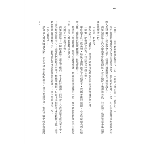 「仔細聽著,保羅。我遲早會想到辦法拿到它,因為在這個世界上我唯一想做的就是離開這個世界。今天你可以不理我,把它放回去,迫使我自己在一個可怕的夜晚,用我殘破的手腳爬到我父親的書房,那樣我會更沒有尊嚴。但如果那樣的話,你就永遠不會知道我要告訴你的事情了。」