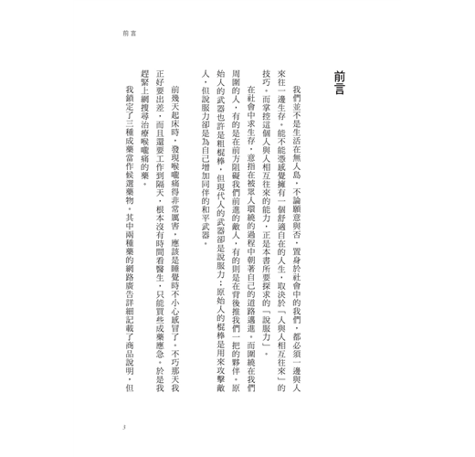 本書並不打算談論「欺瞞」這類為了自身利益而操作對方心理的誘導技巧,畢竟這類技巧多半都是在當下耍一些小聰明。因此,如同本書書名,本書主題的重點在於強化我方論點、增強說服力的方法。