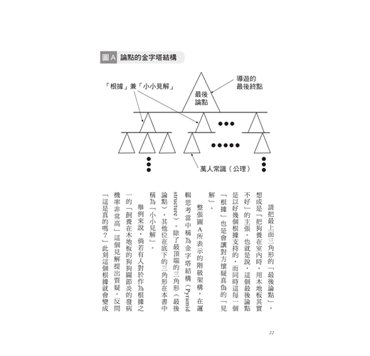 整張圖A所表示的階級架構, 在邏輯思考當中稱為金字塔結構(Pyramid structure)。除了最頂端的三角形(最後論點),其他位在底下的三角形在本書中稱為「小小見解」。