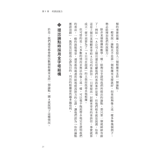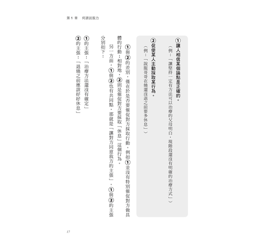 ★此外,讓對象清楚瞭解我方想要表達的宗旨,亦是構成說服力的重要要素。書中針對表達技巧的原理、運用有許多詳細的解說,ex「淺顯易懂的表達方式」、「如何讓對方快速抓住重點」、「譬喻」、「斷句」等等。