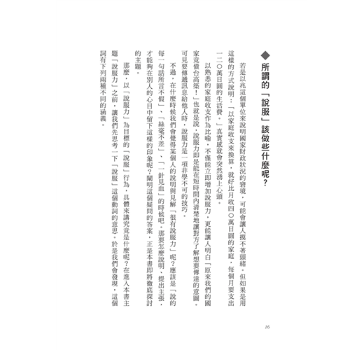 以熟悉的家庭收支作為比喻,不僅能立即增加說服力,更能讓人明白「原來我們的國家竟債台高築!」也就是說,說服力即是能在短時間內清楚地讓對方了解想要傳達的意圖。可見要傳遞訊息給他人時,說服力是一項非學不可的技巧。