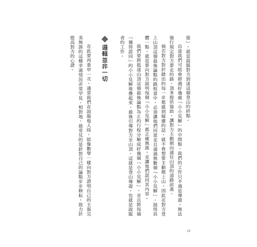 倘若對方對於踏出的每一步都感到疑慮的話,就不會想要主動爬上山。因此在對方登上山頂這個最後論點的路程當中,必須讓他們同意並且通過無數個「小小見解」。說得具體一點,就是要向對方說明每個「小小見解」都正確無誤,並讓他們認同其內容。