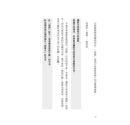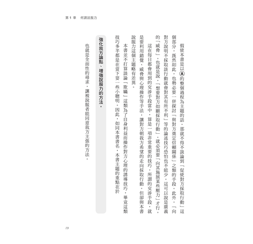 ★書中完整分析了被說服對象的思維模式及心理,並以此為基礎延伸出了應對模式及解決辦法。
