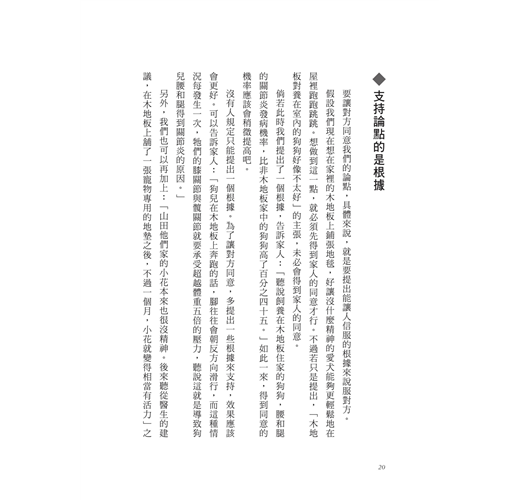 沒有人規定只能提出一個根據。為了讓對方同意,多提出一些根據來支持,效果應該會更好。可以告訴家人:「狗兒在木地板上奔跑的話,腳往往會朝反方向滑行,而這種情況每發生一次,牠們的膝關節與髖關節就要承受超越體重五倍的壓力,聽說這就是導致狗兒腰和腿得到關節炎的原因。」