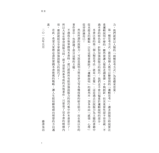 不過我在執筆撰寫本書時,就已經將所有能加強說服力的技巧集中於本書當中了。所以大家在學習說服力時,就不須要再參考我的其他著作。只要看了這本書的精簡內容,應該就能完全掌握加強說服力的技巧了。