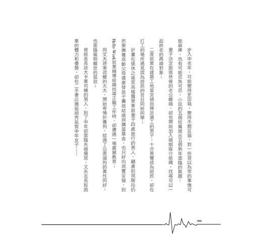 某天在台北市中心的斑馬線上,看到一位熟齡女子,頭髮應該是剛去髮廊上過髮捲,類似八九零年代流行的法拉頭,穿著緊身桃紅色上衣,搭配黑色傘狀迷你裙,下面是黑色網襪,和一雙紅色高跟鞋。她跟斑馬線另一頭走來的中年男子開心相擁,「等很久嗎?」「還好!」男子摸摸女子的頭,男子穿著老派的格子西裝,也是八九零年代流行的款式。目測兩人年齡應該都超過70歲了,或稍年輕或更老,畢竟年齡到了某個階段之後,光從外表很難判斷。