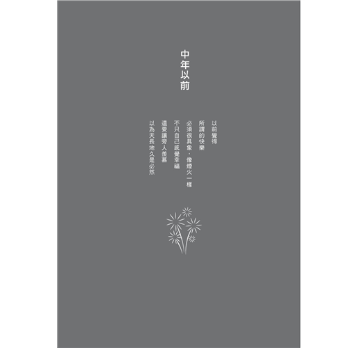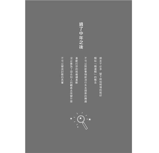 開始意識到中年,或許是晨起面對鏡子的剎那沮喪,或許是照片裡的自己出現細微的老態,那真是日積月累之後讓人不得不認命的殘忍。歲月來勢洶洶,既不暗示,也不掩飾,直直地來,用意鮮明。
