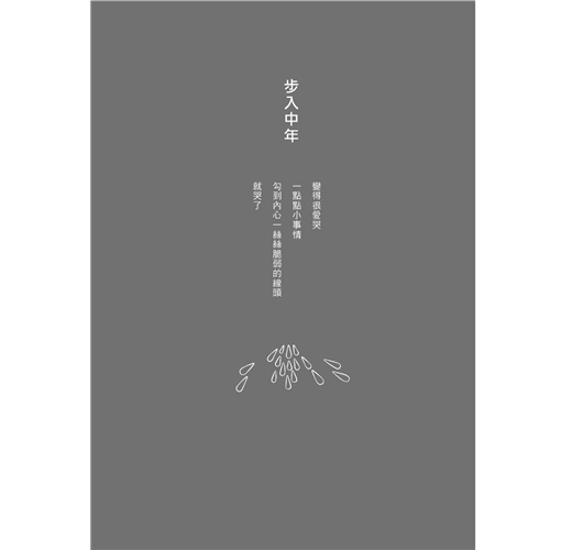 被說愛哭濫情反而有點高興,因為情感氾濫之後,自然會順著人生閱歷的微血管分流而去,直到手足的末稍為止。若因為步入中年就強迫自己必須勇敢必須豁達必須認命,那倒也不必要,重要的是該有一顆容易感動且有溫度的心,我覺得那比加諸在中年身上任何功成名就的期望,都要來得溫柔而有力量。