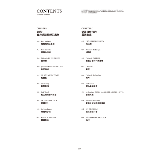 成為店主兼甜點師、活躍於海外的知名競賽等,年齡在35歲到45歲的甜點師傅站上新的舞台,將自己的可能性拓展得更為寬廣。特別是過去幾年,有潛力的甜點師傅相繼獨立開業,令人感覺到這個世代層的厚度。本章關注的是,為業界帶來新氣象的15名甜點師傅,他們靈活的發想力。