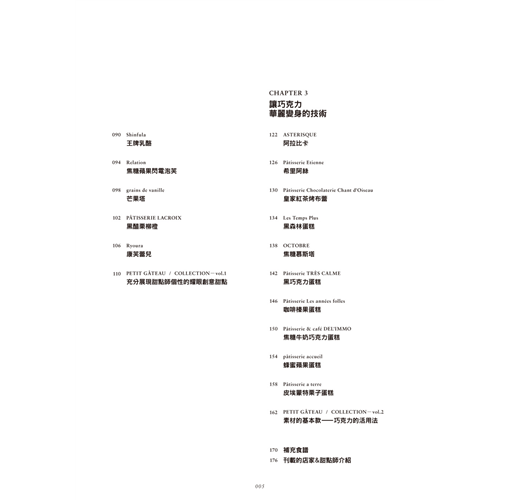 巧克力隱藏著令眾人為之著迷的特殊魅力。以小蛋糕來說,也是基本的材料,有的店家製作出多數人都很熟悉的「巧克力風味」,呈現巧克力的多種風貌,有的店家則是追求醇厚的味道以因應特別節日的需求,可以有多樣的表現這點,也是巧克力的魅力所在。本章將仔細介紹10名甜點師傅巧妙的「巧克力運用法」。