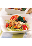 4 取出烤好的雞腿,放在生菜盤中,趁熱撒上熟白芝麻及巴西利碎,再加上小番茄、玉米筍及綠花椰菜裝飾即可。