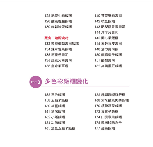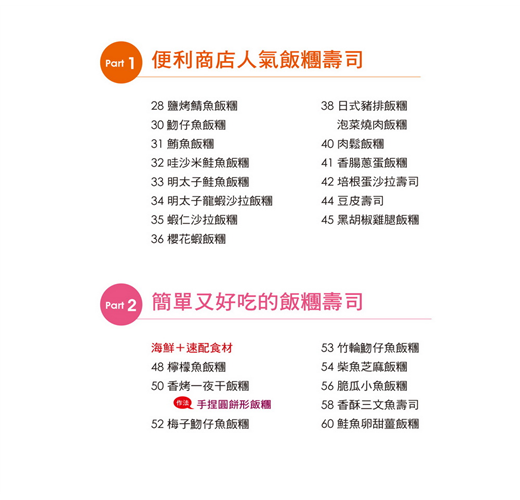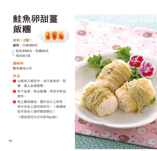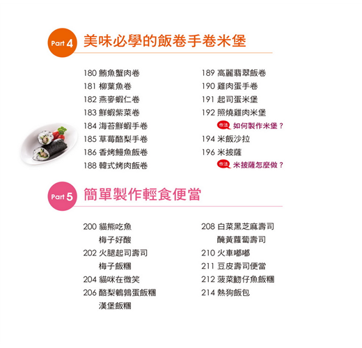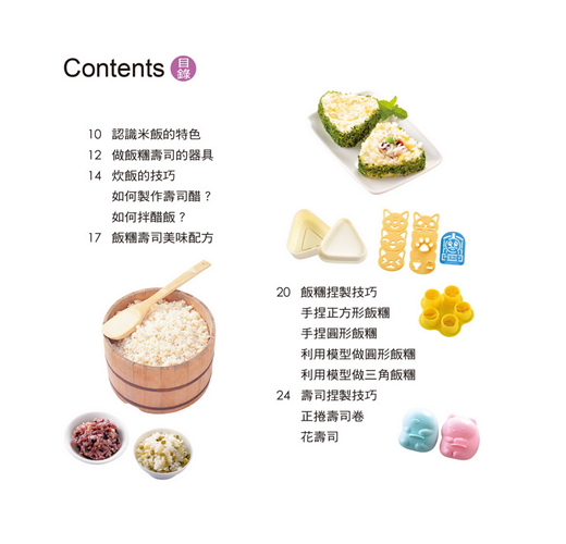 ● 介紹多種飯糰(正方形、三角形、圓形、圓餅形等)、壽司(正捲壽司卷、花壽司)的捏製技巧,以及飯卷手卷米堡的製作,適合全家人一起享受手作的樂趣。
