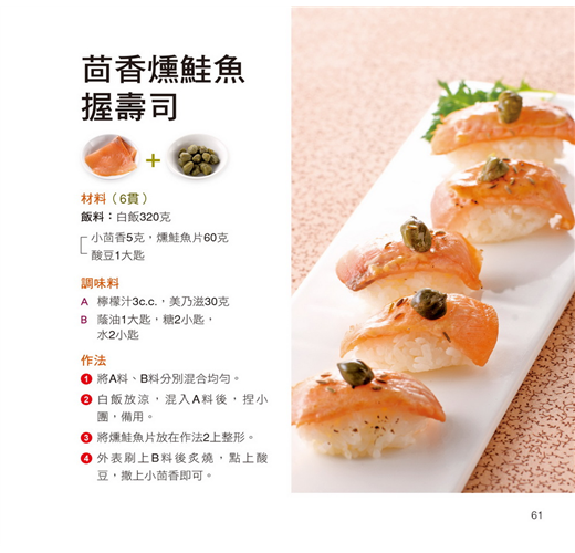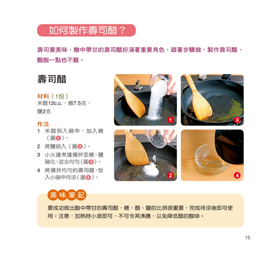 ● 專業老師撰寫,從基礎到變化,圖文示範,製作壽司醋、拌醋飯一點也不難,飯糰壽司種類多樣,口感零距離!