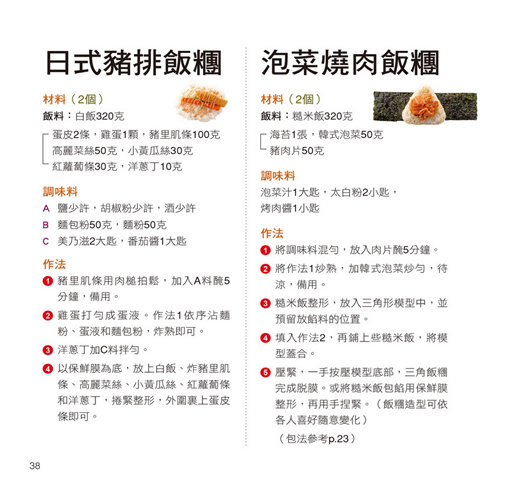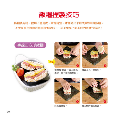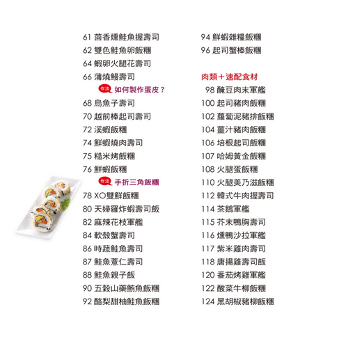 ● 飯糰壽司延伸至便當應用,野餐露營必學,快速簡易輕鬆做,是上班族、輕食族,在炎夏午、晚餐的另一種選擇。
