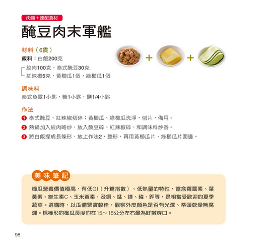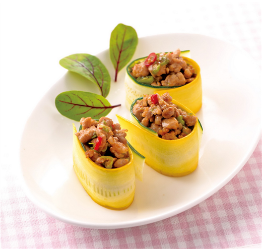 1 泰式醃豆、紅辣椒切碎;黃櫛瓜、綠櫛瓜洗淨,刨片,備用。