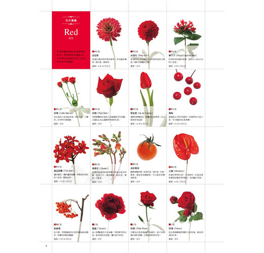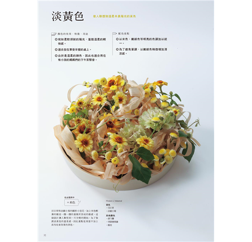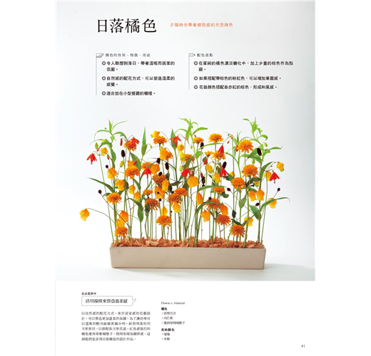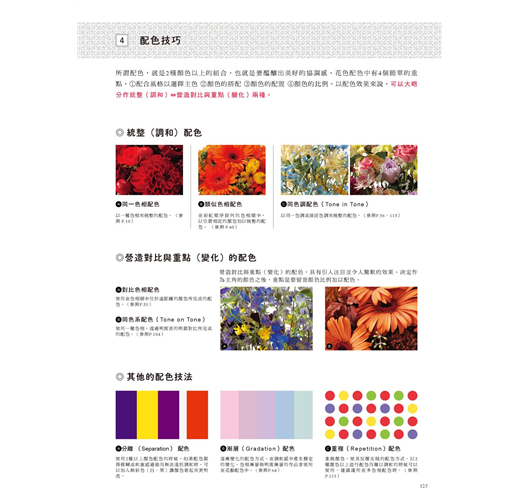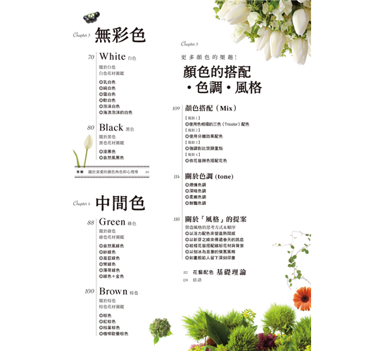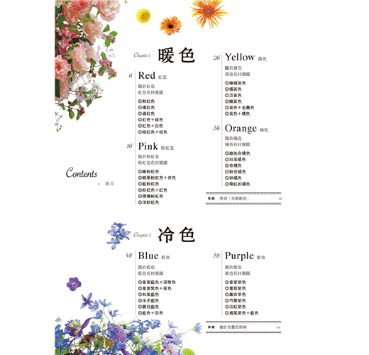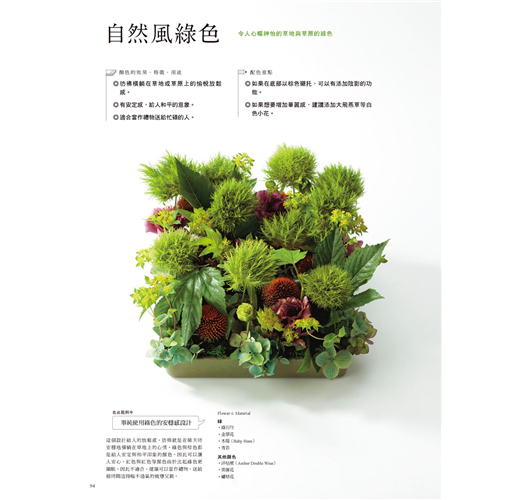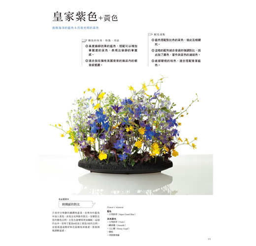 書中將花的色彩分為暖色、冷色、無彩色與中間色等四個主要色系。在身為暖色的紅色花之中,加入一點綠色,成為對比強烈、充滿個性風格的作品;若在紅色中加入一點白色花,便成了充滿和風氣息的年節花!每個顏色也有屬於自己的樣貌與個性,如藍色,讓人聯想到「寂靜」、「真實的愛」、「真實」、「海」、「安寧」、「悲傷」……當想要表達類似主題的作品時,便可善用顏色的關鍵字,來組合出充滿整體感的調性。