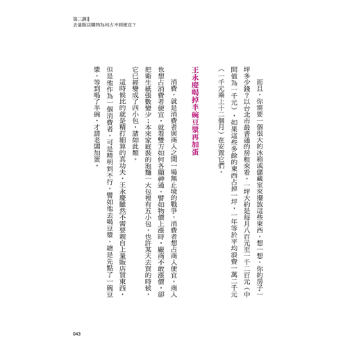 這時候比的就是精打細算的真功夫,王永慶雖然不需要親自上量販店買東西,但是他做為一個消費者,可是精明到不行,譬如他去喝豆漿,總是先點了一碗豆漿,等到喝了半碗,才請老闆加蛋。