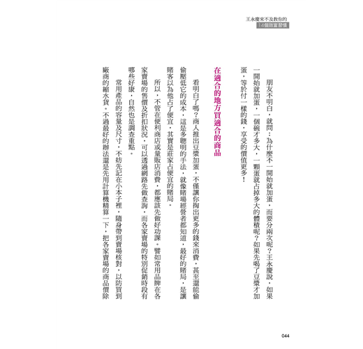 朋友不明白,就問:為什麼不一開始就加蛋,而要分兩次呢?王永慶說,如果一開始就加蛋,一個碗才多大,一顆蛋就占掉多大的體積呢?如果先喝了豆漿才加蛋,等於付一樣的錢,享受的價值更多!