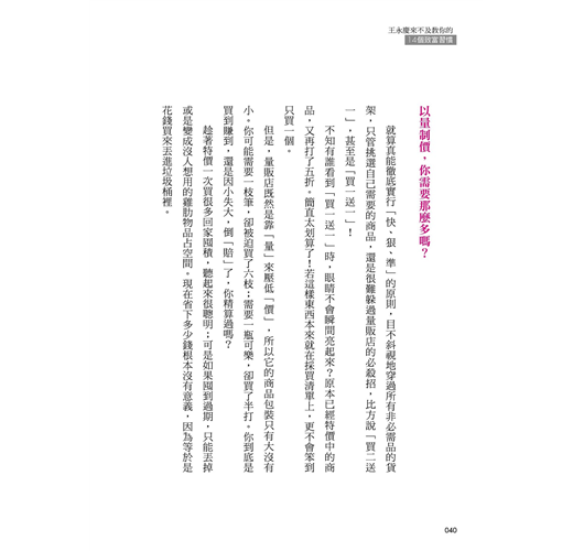 消費,就是消費者與商人一場無止盡的戰爭,消費者想占商人便宜,商人也想占消費者便宜,就看雙方如何各顯神通。譬如物價上漲時,廠商不敢漲價,卻把衛生紙張數變少,本來家庭裝的泡麵一大包裡有五小包,也許某天去買的時候,它已經變成了四小包,諸如此類。