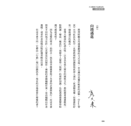 從賣米開始,白手起家的王永慶,創造出橫跨三大洋五大洲的台塑集團王國,並成為台灣企業家勤樸實幹形象的代表人物。本書以王永慶的財富智慧,透過漫畫情境劇,以及最簡單、精闢的公式圖解,徹底剖析有錢人的理財觀,這是一本每個人都應該讀,每個人都一定能懂的平民理財書,除非,你不喜歡成為有錢人。