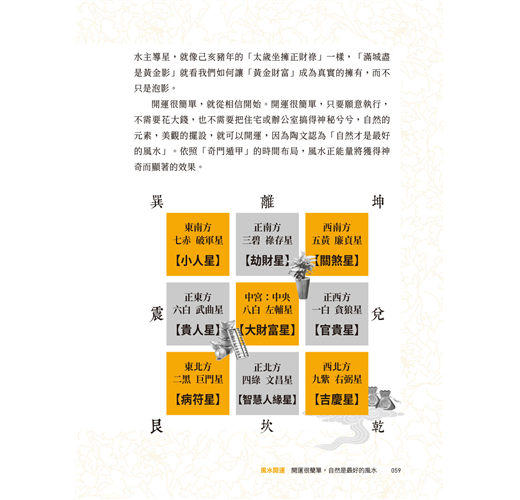 ●風水造吉從東、東南、南、西南、西、西北、北、東北、中9個方位,以平面圖點出吉凶方位,教你逢凶化吉的方法,順手就能幫自己轉運!
