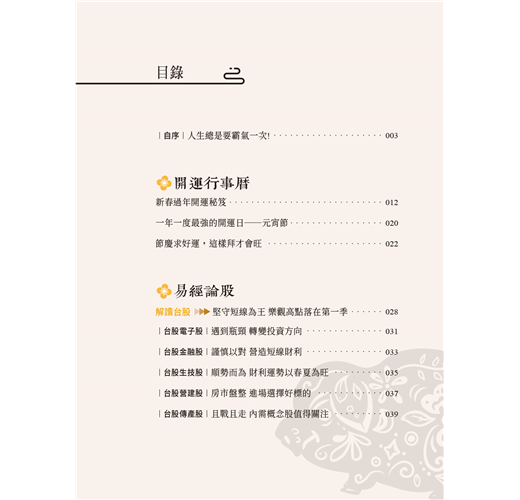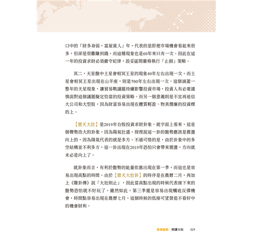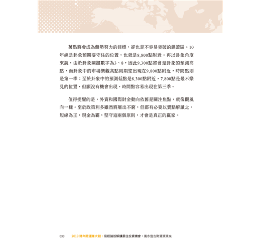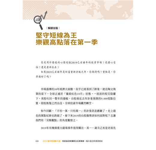 ●易經論股解讀台股高低點,剖析電子股、傳產股、金融股、營建股及生技股2019年投資機會,並分析歐、美、中國大陸等國內外股市發展。