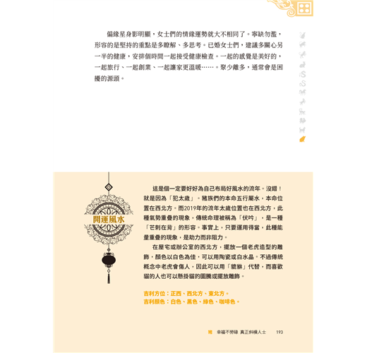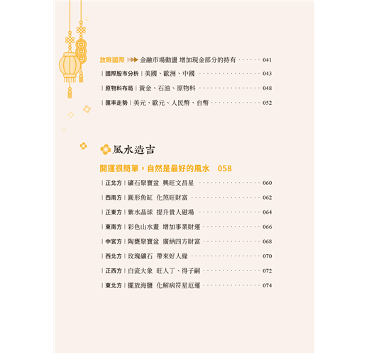 更不可錯過的是風水開運妙方,透過簡單的居家及辦公室擺飾,就可以擺脫厄運,迎向光明面!除此之外,每年都要看的十二生肖運勢,幫你掌握事業、愛情和財運……。
