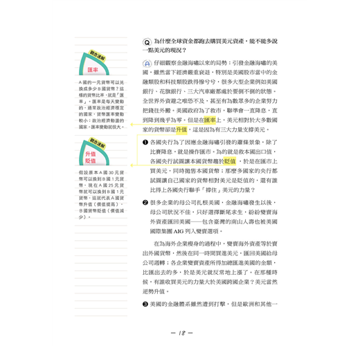 照理來說,一個國家如果經濟衰退,企業和資金會外逃,貨幣就會貶值。尤其美國在金融海嘯之後採取量化寬鬆政策,大量印製鈔票、對外債臺高築,美元卻沒有想像中的弱勢。美元此時的強弱表現已經與美國的國力無關;而是因為全球以美元為交易及清算工具的歷史久矣,一時之間,尚無其他貨幣可以替代。全球資金為避險匯集美國,房地產、債市在當時又不是令人放心的投資標的,於是股票成為投資首選,穩住了美國股市。