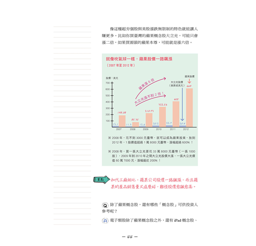 所以,只要蘋果公司的產品大賣,所謂的蘋果概念股都會跟著沾光,股價連袂上漲。這就是為什麼大家一提到蘋果概念股,多數投資人第一個想到的就是鴻海、宸鴻、可成;提到美國的英特爾,投資人會聯想到臺灣的臺積電。而這些國內大型個股業績增長的主因,都是因為接到美國的訂單;也就是說,鴻海、臺積電、可成、大立光等臺灣上市公司的收入來源,和這些美國公司密不可分。