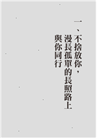 盡頭,只能是心底一抹一閃即逝、不敢想像的奢侈念頭。我不相信,也拒絕看著台灣社會走到家家自掃門前雪莫管他人瓦上霜的盡頭。政府粗糙的長照財源拼湊雖然窘態畢露,但長照二‧○終究已如火如荼的展開,未來的截長補短值得期待。企業和宗教團體也紛紛跨出並擴大各項公益事業的同時,建構這個美好社會的最後一塊藍圖就是每一位如你我般力量微弱的個體,讓我們試著一起彌補陰暗角落裡的殘缺,一起找回台灣逐漸流失的過去……