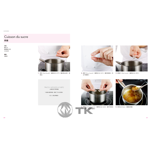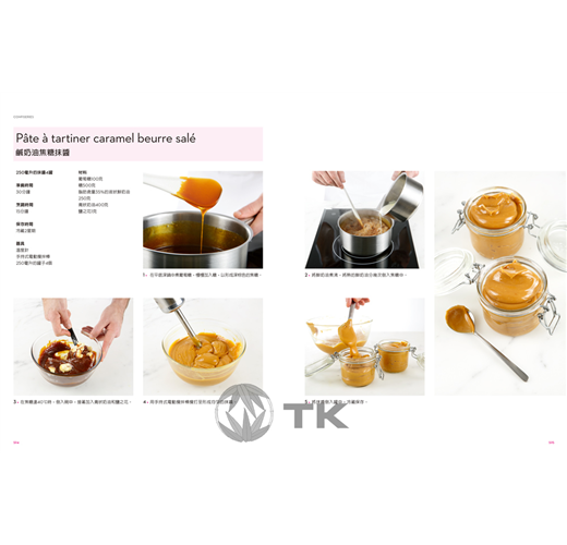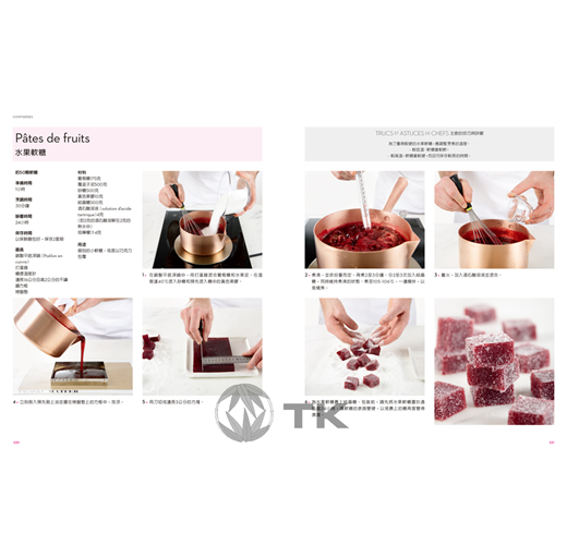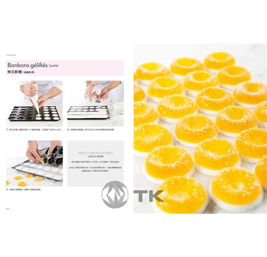 520 Confiseries糖果 520煮糖(Cuisson du sucre) 522麵包抹醬(Pâte à tartiner) 524鹹奶油焦糖抹醬(Pâte à tartiner caramel beurre salé) 526牛軋糖(Nougats) 530水果軟糖(Pâtes de fruits) 532鹹奶油焦糖軟糖(Caramels au beurre salé) 534棉花糖(Guimauve) 537巧克力焦糖杏仁和榛果(Amandes et noisettes caramélisées au chocolat) 540橡皮糖(Bonbons gélifiés) 545玫瑰果仁糖(Pralines roses) 547烘焙堅果醬(Pâte de duja) 548乾煮焦糖帕林內(Praliné au caramel à sec) 550以搓砂法(sablage)製作的帕林內(Praliné)