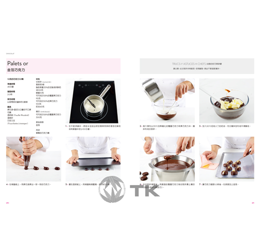 570 Chocolat巧克力 570隔水加熱巧克力調溫法(Mise au point due chocolat au bain-marie) 572大理石巧克力調溫法(Mise au point du chocolat par tablage) 574半球巧克力塑型(Moulage de demi-oeuf en chocolat) 576模塑巧克力磚(Moulage tablette au chocolat) 578岩石巧克力球(Rochers) 580金箔巧克力(Palets or) 582松露巧克力(Truffe) 584千層帕林內果仁糖(Pralinés feuilletines) 586占度亞榛果巧克力(Giandujas)