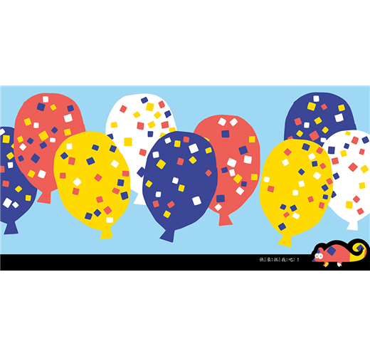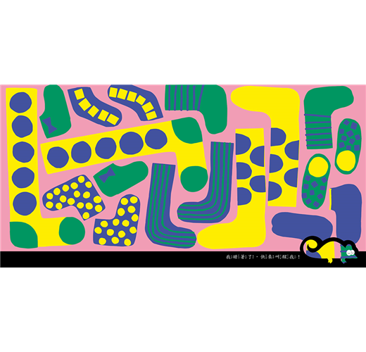 由《找找變色龍》的書名來看,主角固然是變色龍,然而,變色龍隱身的各種環境配角,也可以成為親子共讀時發揮天馬行空想像力的靈感泉源。共讀時,家長除了按照文本的文字說出「找找我在哪裡?」、「你找到我了嗎?」、「你能找到我嗎?」之外,親子也可以依照畫面中圖像的形狀或是顏色發揮聯想力,為每一個畫面加油添醋說故事,譬如在第26頁,可以這麼說:「為了找變色龍,小朋友來到了五顏六色的糖果山,這裡有橢圓形橘子口味的糖果,有圓形的紫色葡萄糖果,有方形的大海口味糖果,有酸酸甜甜的檸檬糖果⋯⋯等等,到底變色龍藏在哪裡呢?」