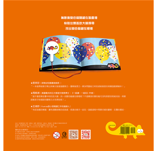 這是一本親子可以一起玩好久的找找看遊戲書,豐富的圖像色彩和互動性的設計,會立即吸引孩子的注意力,誰不會想拿起書中附的放大鏡,找一找變色龍藏在哪裡呢?不過厲害的變色龍可沒有那麼容易被找到,得要啟動孩子對細節的觀察力才找得到呢!