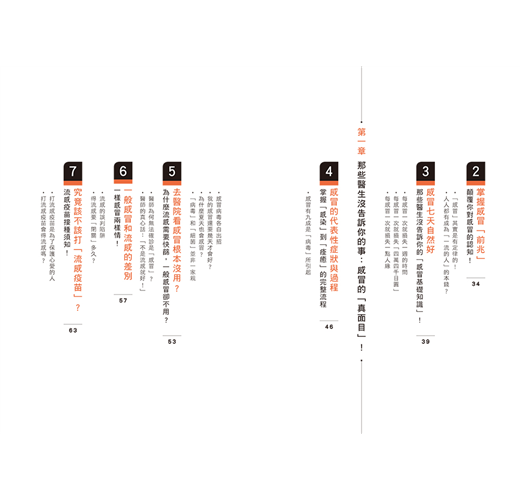包括什麼樣的人容易感冒、如何發現「超初期症狀」、什麼樣的場合要注意、防止感冒的小技巧等。