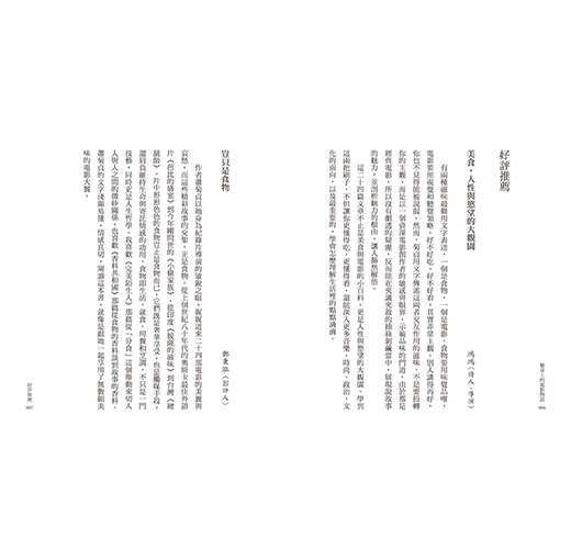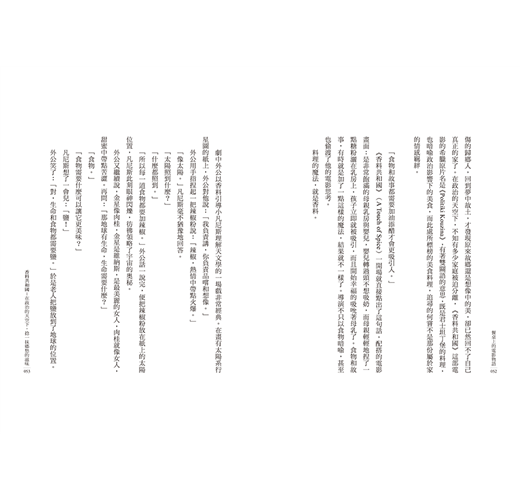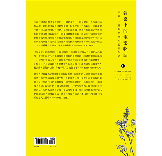 作者蕭菊貞以她身為紀錄片導演的敏銳之眼,娓娓道來24部電影的美麗與哀愁,而這些精彩故事的交集,正是食物。從上個世紀八十年代的奧斯卡最佳外語片《芭比的盛宴》到今年剛問世的《小偷家族》,從印度《披薩的滋味》到台灣《總舖師》,片中形形色色的食物豈止是食物而已,它們既是奢華享受,也是觸媒手段,還肩負維持生命與寄託情感的功用,食物即生活,就食、用餐和烹調,不只是一門技藝,同時更是人生哲學。我喜歡《完美陌生人》那篇從「分食」這個舉動來切入人與人之間的微妙關係,也喜歡《香料共和國》那篇從食物的香料談到故事的香料,蕭菊貞的文字淺顯易懂,情感真切,閱讀這本書,就像是跟她一起享用了無數頓美味的電影大餐。