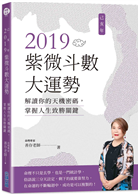 紫微斗數命理書籍暢銷作家、命理名師──善存老師,透過淺白的文字、條理的剖析,以理論、實用兼具的特色,以及易懂易讀的命盤表分析圖,讓讀者輕鬆認識紫微斗數,在本書裡會指導讀者如何找出個人的專屬命盤,並看懂2019己亥流年天干的四化星飛入你本命的哪些宮位,再配合此宮中其他星曜對比的強弱以及吉星與凶星數量的多寡,來判斷在2019年裡,該如何趨吉避凶,有所作為。