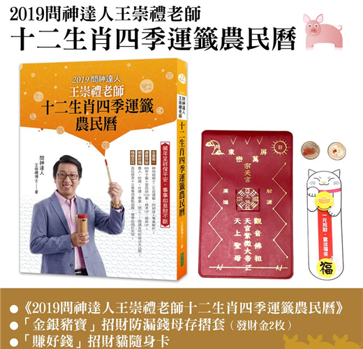 本書特別隨書贈送宗天宮媽祖、紫微大帝加持的「金銀豬寶」招財防漏錢母存摺套,希望能讓大家在豬年財源廣進,並盡量減少漏財、破財,達到「年年有餘」之效!