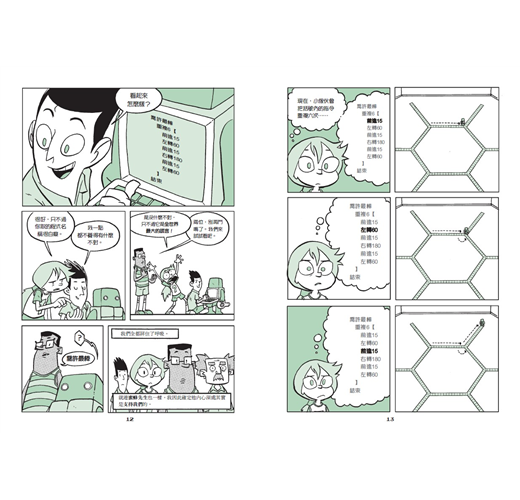 話說小孩們上國中、小學後,家裡已經累積不少小天下出版的書,不管是人文還是知識類的書籍,我和孩子們信賴小天下編輯團隊的用心選書。這回聽說小天下要引入一系列有關於「程式」的美國漫畫,我的眼睛馬上亮起來。這真是一個好點子,藉由輕鬆有趣的漫畫,將抽象的程式邏輯概念,利用故事的發展,以漫畫的影像具體呈現出來。我隨著漫畫中這個剛轉學女孩的緊張寂寞視野,一步步發現這個新學校不尋常的人事物,藉由漫畫中如何操控機器鳥的方式,我跟著這女孩了解程式語言的基本概念。第二集開始,我已經感受到這漫畫的富厚度,相當期待之後引領到更慎密的程式設計概念。書中美國青少年與同儕及師長的互動,除了能引起讀者共鳴的青少年敏感心理與反應行為外,也點出美國學校文化與台灣的不同,相當有趣。