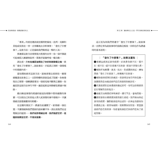 如你所見,「發生了什麼事?」說故事法刻意設置了一個限制,要求你公平公正地看待自己的經驗,去除每個人在說故事時常忍不住加上的意義和批判。
