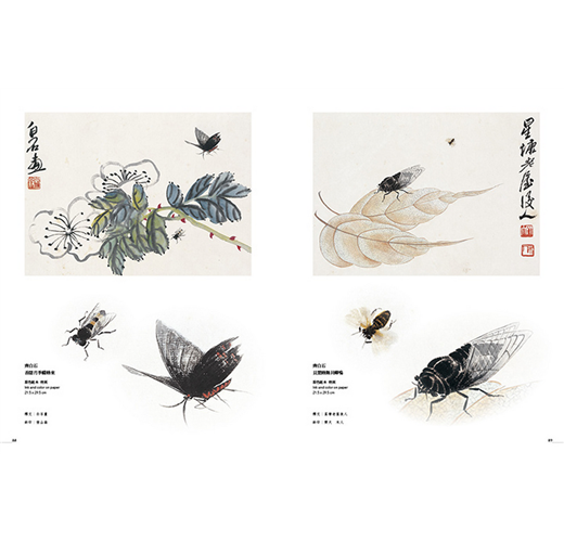 白石每完成一張蟲蝶,即將其收整妥當,待多年後取出,紙張膠礬稍退,張張補繪以花草,亦不拘一格,大筆草草,自然天成。此時用筆大膽而多樣,用色更為讓人驚嘆,所選繪之花草,皆常人所常見,直接掌握人之視覺效果,毫無障礙,此為白石之美術語言過人之處,他人難於仿學!