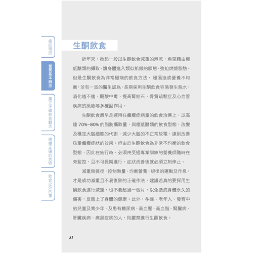 生酮飲食為非常極端的飲食方法,極易造成營養不均衡,若真要採用生酮飲食進行減重,也不要超過一個月,以免造成身體永久的傷害。此外,孕婦、老年人、發育中的兒童及青少年,及患有糖尿病、高血壓、高血脂、腎臟病、肝臟疾病、痛風症狀的人,則嚴禁進行生酮飲食。